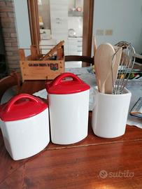 1) tre oggetti con gufi rossi: 2 barattoli con coperchio rosso, uno grande (cm. 9 X 10 alto cm. 15) e uno più piccolo (cm.9 X 10 alto cm. 11)e un porta cucchiai in legno con 3 cucchiai e una frustina. Euro 13,00