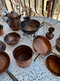 Collezione unica composta da 12 pezzi originali in rame d'epoca, ciascuno con dettagli e forme diverse, provenienti dalla tradizione contadina e artigianale italiana. Ideali come decorazioni rustiche, per arredare cucine vintage o per chi ama collezionare