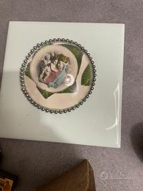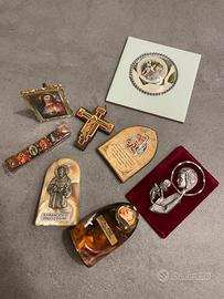 Lotto composto da 8 pezzi come da foto. Crocifisso in legno, padre pio, sacra famiglia, san francesco, madonna, braccialetto con icone. Prezzo per tutti gli oggetti presentati.
