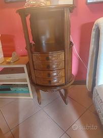 Vendo mobiletto ovale, rifinito anche dietro, tavolino bianco , in legno, altri oggetti, 2 phon nuovi uguali, tavolino a due piani, in legno, ferro da stiro in ferro, macinino, in legno. Tutto ilin blocco.