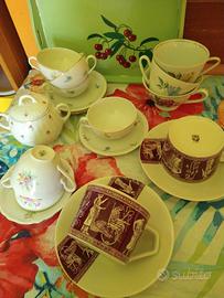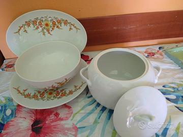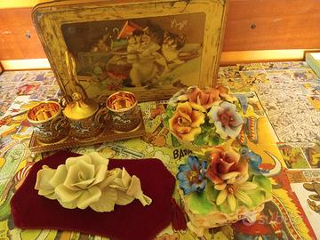 statua natività anni 80, bicchieri anni 60 vassoio in legno con ciliegie, tazze con piattini varie e zuccheriera anni 50/60, scatola in latta grande con simpatici gattini anni 60, 2 porta gioie con graziosi fiori, quadretto colore vinaccia con rose in Capodimonte, tazzine con zuccheriera con piccolo vassoio con disegni di caccia, piatti da portata in ottima c porcellana con graziosi fiorellini arancioni anni 70, zuppiera bianca anni 70, porta fiori con 2 porta oggetti più portacenere in vetro anni 70. vendo tutto in blocco non divido.