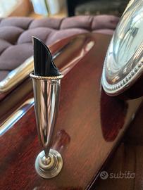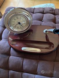 Oggetto d’arredamento per scrivania in legno massello lucidato e argento 925 con orologio funzionante, in perfette condizioni come nuovo.