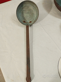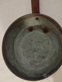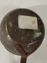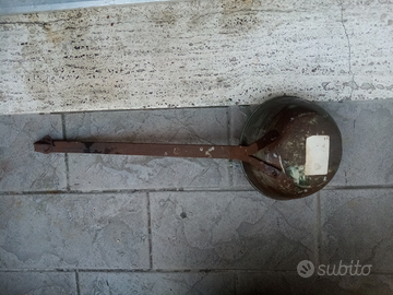 Oggetto in rame con manico in ferro. Lunghezza 53 cm. Circoffrenza 52cm. Altezza 6cm.