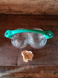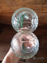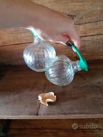 Bottiglia doppia in vetro stampato a rilievo, due bulbi affiancati con bocche separate e manico in plastica verde removibile. Produzione italiana, anni ’60 circa. Utilizzabile come oliera/acetiera per servire olio e aceto insieme, o come set da condimenti decorativo.