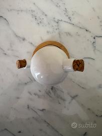 Pratico e originale dosatore per condimenti dal design "2 in 1". Realizzato in ceramica bianca dallo stile minimalista, è dotato di due beccucci a diverse altezze con tappi in sughero e poggia su una base in legno. Il design permette di contenere sia l'olio che l'aceto in due scomparti separati all'interno dello stesso oggetto, risultando comodissimo e salvaspazio a tavola. Ottime condizioni, nessun difetto o sbeccatura strutturale, tappi in sughero intatti.