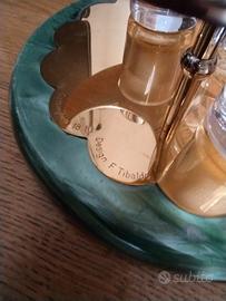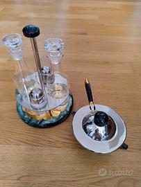 Gottinghen, menage vintage. Servizio da tavola, olio, aceto, sale, pepe + formaggiera. Cristallo trasparente liscio e acciaio inox. Base in madreperla e acciaio placcato oro 24k. Design Tibaldo. Perfette condizioni.
