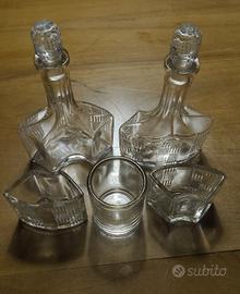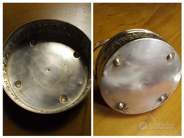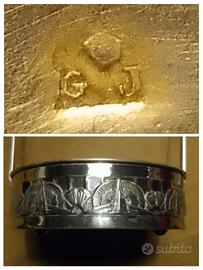 Deliziosa oliera francese art decò placcata argento, punzonata GJ. Ampolline sfaccettate e sagomate a forma circolare con disegni geometrici, complete dei i loro tappi originali, anch'essi riprendono il medesimo disegno. Insieme alle due ampolline ci sono i vasetti del sale e del pepe, al centro il vasetto rotondo porta senape. Bella in tavola ma anche per essere esposta. Guarda anche le altre oliere che ho pubblicato su questo sito.