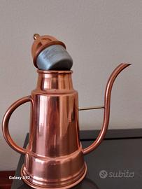 Oliera nuova, in rame liscio con coperchio. Misura altezza cm 19, base 9,5 cm.