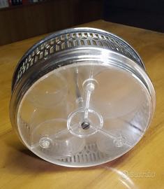 Il manico svitabile tiene insieme il telaio argentato e il porta ampolline di materiale plastico. Ci sono due ampolline con i loro tappi ma mancano le ciotoline del sale e del pepe. Guarda anche le altre oliere che ho pubblicato su questo sito.