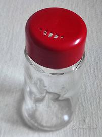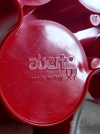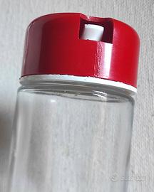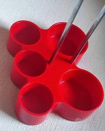 Oliera vintage mod. Pony salvagoccia 5 pezzi con salini e portastecchi, supporto e scatola originale dell'epoca. Marchio Abert. Design italiano anni '70. Colore rosso, in plastica, vetro e acciaio.
