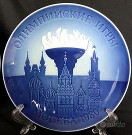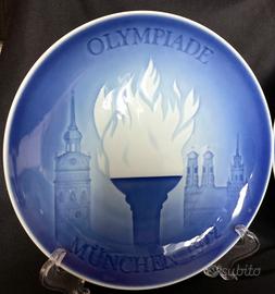 Tre piatti vintage commemorativi delle Olimpiadi, c.d. estive, del 1972 a Monaco di Baviera, del 1976 a Montreal e del 1980 a Mosca prodotte dalla manifattura Bing & Grondhal, ora Royal Copenhagen, Denmark in fine porcellana danese bianca con decori blu.