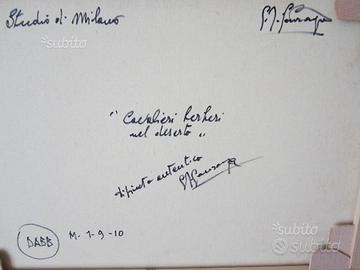 Intitolato cavalieri berberi nel deserto. Dallo studio di milano, esempio perfetto della pittura del maestro del figurativismo italiano. 50x70 cm.