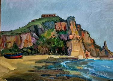 quadro incorniciato ad olio del pittore Manfredo Acerbo opera pubblicata nella Monografia del pittore dal titolo " Darsena Mongiove Terracina misure dell'opera 70x50