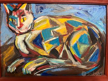 splendido olio su cartone che ritrae un gatto in stile espressionista.