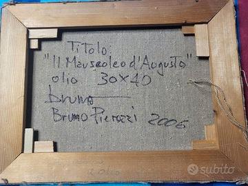 Bruno Pierozzi è un Maestro d'Arte specializzato in tecniche pittoriche tradizionali. La sua pittura fonde la tradizione figurativa del Novecento italiano (con richiami alla "Scuola Romana") con la semplicità e la ricerca dell'essenziale propria della cultura Zen. Predilige scorci di Roma e "frammenti di vita quotidiana", trasformando luoghi spesso considerati banali o decadenti in visioni poetiche e senza tempo, è un profondo conoscitore della pittura a tempera all'uovo. Questa opera raffigura l'ingresso monumentale del Mausoleo di Augusto a Roma, colto in un'atmosfera di quiete senza tempo. Il dipinto mostra il maestoso portale d'accesso al mausoleo, incastonato in una struttura di mattoni antichi e vegetazione incolta. Il punto di vista frontale enfatizza la monumentalità della struttura romana. I cipressi che svettano sullo sfondo, simboli di eternità legati alla natura funeraria del sito, incorniciano la composizione aggiungendo un senso di verticalità. Le pennellate sono visibili e materiche, dando corpo alla pietra e alla vegetazione. L'opera non cerca il dettaglio fotografico, ma punta a restituire l'essenza spirituale e storica del luogo, filtrata attraverso una sensibilità moderna. Titolo: Il mausoleo di Augusto. Dimensioni: 30x40 Olio su tela Firma autografa in basso a destra e sul retro.