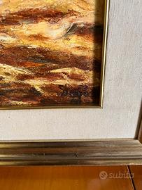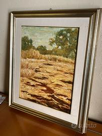 dipinto a olio su tela raffigurante un paesaggio campestre di produzione moderna opera del maestro franco dugo. Raffigurante Un sentiero di campagna circondato da vegetazione secca o dorata e alberi sullo sfondo. Stile Espressionista con pennellate materiche e visibili. Il quadro è incorniciato con una cornice in legno dorato e un passepartout in tessuto chiaro.