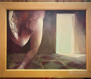 In vendita pregiata opera d'arte della pittrice bresciana Lucia Manenti, datata 1978. Il dipinto, un olio su tela di grandi dimensioni (80x90 cm), rappresenta una delle tematiche più amate e ricercate dell'artista: lo studio del corpo umano in chiave simbolista. Descrizione dell'opera: L'opera raffigura la figura di un Cupido, colto di spalle, mentre si dirige verso una soglia illuminata da una luce intensa e metafisica. La resa anatomica delle natiche e della schiena testimonia l'eccezionale maestria tecnica della Manenti, capace di unire il rigore accademico a un'atmosfera onirica e sospesa. Il contrasto tra le zone d'ombra e l'apertura luminosa della porta conferisce al quadro una profondità e un fascino magnetico. Dettagli Tecnici: • Autore: Lucia Manenti (Scuola di Brera) • Anno: 1978 (Periodo di piena maturità artistica) • Tecnica: Olio su tela • Dimensioni: 80 x 90 cm • Stato: Ottimo stato di conservazione. • Stile: Figurativo contemporaneo / Simbolismo / Realismo magico. Opera ideale per collezionisti di arte del Novecento o per arredare ambienti eleganti con un pezzo di forte impatto visivo e culturale. Disponibile per visione.