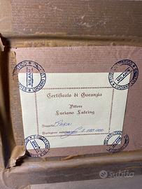 Dipinto in olio su tela Luciano LUTRING soggetto Parigi, firmato e autenticato . ORIGINE Italia, PERIODO 1995 AUTORE Luciano LUTRING (1937 - 2013) è stato un criminale, scrittore e pittore italiano. Luciano Lutring nasce a Milano da Elvira Minotti e Ignazio Lutring e passa la sua infanzia nel milanese, sotto la guida dei genitori che volevano fare di lui un violinista. Ben presto manifesta però la sua natura ribelle e il suo amore per le belle donne e per la bella vita. Attratto dal mondo della malavita, compra da un conoscente la sua prima pistola, una Smith & Wesson della polizia canadese, senza pallottole in quanto non erano più in commercio; da quel momento in poi il giovane Lutring acquisterà il soprannome de l'Americano. La sua fama nasce nella Milano degli anni sessanta. Soprannominato "Il solista del mitra" per la sua usanza di nascondere il fucile mitragliatore nella custodia di un violino, conclude centinaia di rapine fra Italia e Francia, per un bottino totale, da lui stimato, attorno ai trenta miliardi di lire dell'epoca. ... Da quel momento inizia la sua carriera di fuorilegge, fatta di remunerative rapine in molte banche e negozi, compiendone più di cinquecento. La figura di Lutring diviene leggendaria, assieme al suo stile di vita di latitante... Il 1º settembre 1965 viene infine ferito e arrestato a Parigi; sconta in Francia 12 anni di carcere (la condanna iniziale era a 22 anni), durante i quali inizia a scrivere e dipingere; tiene persino una corrispondenza con l'allora Presidente della Camera Sandro Pertini. Nel 1966, con la regia di Carlo Lizzani, esce un film ispirato alla biografia di Lutring, dal titolo Svegliati e uccidi, interpretato da Robert Hoffmann, Lisa Gastoni e Gian Maria Volonté. Graziato dal Presidente della Repubblica francese Georges Pompidou, torna in patria, dove viene nuovamente graziato dal Presidente Leone.