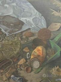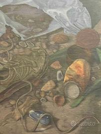 Questo olio su tela di ampie dimensioni (70x80 cm) rappresenta un esempio magistrale della ricerca dell'artista sulla materia e sulla dignità degli oggetti dimenticati.