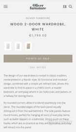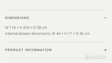 Oliver Furniture Armadio 2 Ante – Bianco | €200 (prezzo orig. €1.799) Bellissimo armadio in stile scandinavo di Oliver Furniture, in ottimo stato. Attualmente smontato, il che facilita il trasporto — ma l’acquirente dovrà rimontarlo (richiede una certa manualità). Dettagli: •L 118 × H 204 × P 58 cm •2 ante + 2 cassetti nella parte inferiore •Lato sinistro: 5 ripiani | Lato destro: barra appendiabiti •Ganci laterali retrattili •Maniglie effetto pelle cognac •SKU: 041352 Al momento non sono disponibili foto del mobile montato in quanto è smontato — per riferimento visivo consultare il sito Oliver Furniture. Solo ritiro — Milano centro (Zona 1). Il prezzo è ridotto per una vendita rapida e per tener conto del rimontaggio necessario. Solo acquirenti seri, grazie.