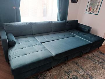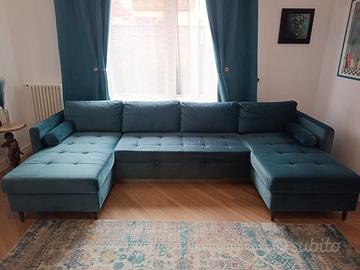 Divano letto chic ed elegante marchiato Maison du Monde, da 7/9 posti in velluto blu. Con il suo formato XXL, c'è spazio per tutta la famiglia. In ottime condizioni, pari a nuovo, vendo per acquisto nuovo. N. 2 vani e comodi contenitori sulle chaise-longue laterali, ideali per riporre cuscini e plaid. Dimensioni letto: 292 x 138 cm. Dimensioni totali divano da aperto: 314,5x155x87 cm. I costi di spedizione possono variare in base alla destinazione.