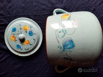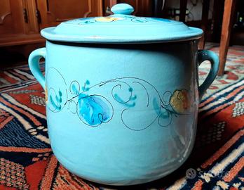 Autentica òlla di tradizione contadina piemontese (in dialetto: “ùla”) dal caratteristico disegno, coperchio e manici; in terracotta smaltata, veniva utilizzata per la preparazione del “Brùss”, il tipico formaggio fermentato prodotto in casa, nelle campagne. Di datazione incerta, fu acquistata negli anni '60, credo al mercato torinese delle pulci (Balôn) o forse presso un contadino. Colore azzurro pastello con decorazioni floreali dipinte a mano sui toni del blu, giallo e arancione, che ricordano le ceramiche tradizionali di Deruta e Vietri. Il bordo del coperchio presenta una scheggiatura reincollata, lunga 8 cm., già presente al momento dell'acquisto e una scalfittura impercettibile di 2 millimetri, sul lato opposto. A parte questo non si evidenzia alcun segno di usura né, tantomeno, la benchè minima presenza di crepe, sia sulla pentola, sia sul coperchio. Ideale come complemento d'arredo, a terra o sopra un mobile, può essere riutilizzata anche come centrotavola, biscottiera (l'odore del formaggio, ancora percepibile 60 anni fa, è completamente svanito) o per la conservazione di ortaggi, grazie alla sua struttura profonda. Dimensioni, in cm: larghezza max, compresi i manici 31; diametro interno minimo 21,6; altezza massima, col coperchio, 26. Visibile a TORINO Porta Susa e, occasionalmente, anche ad ASTI o lungo tutto il percorso Torino-Asti della S.S. 10. Eviterei ogni tipo di SPEDIZIONE, data la fragilità dell'oggetto, ma se interessati scrivetemi.