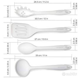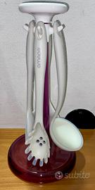 Omada Design - Set di 4 Mestoli in Silicone con Porta Mestoli in plastica, Pratici, Antiaderenti, Antigraffio e Resistenti fino a 230° C, Lavabili in Lavastoviglie, Linea Trendy, colore Viola. Made in Italy. Nuovo, mai usato, confezione originale. Valore commerciale di €56,90 su Amazon. I quattro mestoli sono: cucchiaio, mestolo da brodo, paletta per frittata e servi spaghetti.
