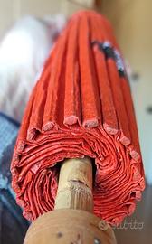 Ombrellino tradizionale parasole thailandese di bambù e carta estratta dalla macerazione della corteccia dei gelsi, misura small. Fabbricato e dipinto a mano, raffigura immagini tradizionali della cultura thailandese. Una delle più antiche tradizioni thailandesi: la costruzione degli ombrelli di bambù, divenuta un simbolo della cultura thai. Nuovo, chiusura originale, acquistato a Bangkok, presso il Siam City Hotel.