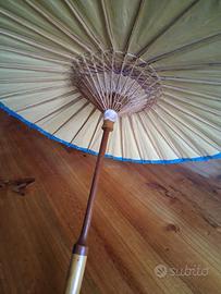 un ombrello in cartone fatto a mano, ricondizionato, presenta ancora qualche inferfezione sui bracci di chiusura e apertura.