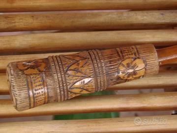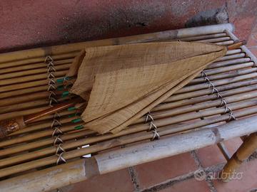 ombrello parasole in juta,in discrete condizioni,con manico in legno finemente lavorato ed inciso.
