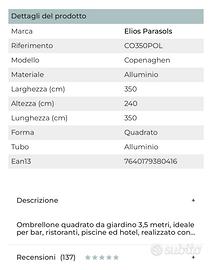 Marca Elios Parasols, forma quadrata ( 350 x 350), struttura in alluminio, colore chiaro.