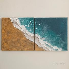 Lasciati trasportare dal suono delle onde con questo dittico dal forte impatto materico. L’opera rappresenta una vista aerea della battigia: l’incontro tra la sabbia calda e il mare turchese viene reso con una ricca texture tridimensionale, realizzata interamente a mano con materiali professionali.