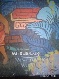 Quadro dipinto balinese Penestanan - Vita al tempio - W. Sureny L'Opera Splendido ed autentico dipinto su tela proveniente da Penestanan, il rinomato "villaggio degli artisti" situato alle porte di Ubud, Bali. L'opera è un esempio magistrale dell'arte tradizionale indonesiana, caratterizzata da una precisione millimetrica e una composizione vibrante. Soggetto e Autore Il dipinto è firmato in basso a destra dal maestro W. SURENY, con l'indicazione della località PENESTANAN - UBUD. La scena raffigura la vita sociale e spirituale presso un monumentale portale di un tempio balinese (Kori Agung). Al centro spicca una figura femminile che trasporta un'offerta sulla testa, circondata da abitanti del villaggio in abiti tradizionali e una lussureggiante vegetazione tropicale. Caratteristiche Tecniche Autore: W. Sureny (Scuola di Penestanan). Tecnica: Dipinto a mano con pigmenti tradizionali su tela. Dettagli: Stile figurativo denso e ricchissimo di particolari (architetture sacre, decorazioni cerimoniali e natura). Stato di conservazione: Eccellente. La tela è integra, i colori sono vividi e ben preservati. Dimensioni: Altezza x Larghezza: 49 x 34 cm. Perché sceglierlo A differenza delle produzioni commerciali, questo pezzo vanta una firma di un autore di un distretto artistico specifico (Penestanan), il che lo rende un pezzo da collezione. È un complemento d'arredo di grande prestigio, ideale per ambienti eleganti, uffici o spazi in stile etnico-chic e coloniale.