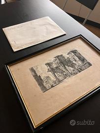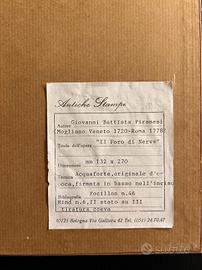 In vendita opera originale d’epoca di Giovanni Battista Piranesi, raffigurante “Il Foro di Nerva”, celebre veduta archeologica di Roma. Valore stimato 600€. 📜 Elemento di grande valore: l’opera è corredata da attestazione di autenticità rilasciata da galleria d’arte dell’epoca, che ne certifica l’originalità e la provenienza. Opera grafica storica di grande fascino, realizzata con la tecnica dell’acquaforte e stampata da lastra originale. Non si tratta di un dipinto né di una riproduzione moderna. CARATTERISTICHE 🔹 Autore: Giovanni Battista Piranesi (1720–1778) 🔹 Titolo: Il Foro di Nerva 🔹 Tecnica: Acquaforte originale 🔹 Dimensioni: 132 x 270 mm 🔹Dimensioni con cornice: 307 x 440 mm 🔹 Spessore: circa 10 mm 🔹 Epoca: incisione di metà XVIII secolo (anno 1748 ca.) 🔹 Bibliografia: Focillon n. 46 Hind n. 6, II stato su III, tiratura coeva 🔹 Cornice dorata con passepartout: inclusa 🔹Attestazione di autenticità: inclusa CONDIZIONI Opera autentica con segni del tempo coerenti con l’età (patina e alonature). Incisione ben leggibile e integra. 📞 Contatto diretto/WhatsApp: 3408849544