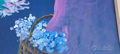 L'opera raffigura una suggestiva scena d'interno con due figure femminili - le fioraie - ritratte di profilo mentre osservano attraverso una finestra. In primo piano un cesto di fiori blu-viola e composizioni floreali rosa. La tavolozza cromatica è tipica del Fantuzzi maturo: tonalità notturne di blu e viola, accese da tocchi di rosso, rosa e giallo.