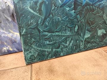- **Descrizione:** Questo dipinto affascinante rappresenta un colorato paesaggio sottomarino. I pesci stilizzati nuotano liberamente in diverse direzioni, con tonalità di blu intenso che dominano la parte superiore della tela, mentre sfumature di verde e dettagli di alghe e rocce arricchiscono il fondale marino. Le linee fluide e i colori vivaci trasmettono un senso di movimento e vivacità, evocando la bellezza e il mistero delle profondità marine.