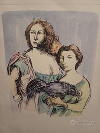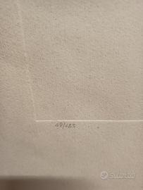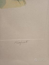 Domenico Purificato – "Due Donne con Gallo" – Litografia Originale Splendida litografia policroma del Maestro Domenico Purificato (1915-1984), esponente di spicco della Scuola Romana. L'opera ritrae due figure femminili dai tratti classici e malinconici, tipici della poetica dell'artista, mentre reggono un gallo. Il segno è deciso, con una raffinata combinazione di acquerellature nei toni del verde, rosa e azzurro. Caratteristiche Tecniche • Artista: Domenico Purificato (Firmato a matita in basso a destra) • Dimensioni Foglio: 50x70 cm • Tecnica: Litografia su carta a forte spessore • Esemplare: Numero 49/125 (Edizione limitata, numerata a matita in basso a sinistra) • Timbro a secco: Presente timbro a secco di garanzia "MIDART MILANO" in basso a sinistra, a conferma dell'autenticità e della qualità dell'edizione. Stato di Conservazione L'opera è in buone condizioni generali. Il fronte presenta colori vividi e carta ben conservata. Sul retro sono presenti lievi tracce di nastro adesivo e naturali segni del tempo ai margini (fioriture molto leggere), che non intaccano la parte figurativa e che verrebbero completamente coperti da una montatura con passe-partout. Note aggiuntive Un pezzo di grande eleganza, perfetto per collezionisti del Novecento Italiano o per arredare ambienti ricercati. L'opera viene venduta senza cornice.