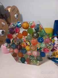 Sei alla ricerca di un'opera d'arte originale e colorata? Questa creazione artigianale è realizzata con resina epossidica di alta qualità e un'accurata selezione di palline rimbalzine, incastonate in una struttura esagonale trasparente. Il risultato è un pezzo vibrante, giocoso e unico nel suo genere, perfetto per decorare qualsiasi ambiente con un tocco di nostalgia e modernità.