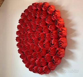 Opera d'arte realizzata con la tecnica dell'origami, raffigurante fiori di loto rossi disposti a formare un cerchio.