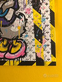 Il soggetto è una vivace Daisy Duck reinterpretata con colori accesi, drip painting, texture materiche e pattern ispirati al mondo luxury, in perfetta linea con le tendenze della pop-art contemporanea.