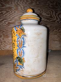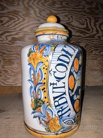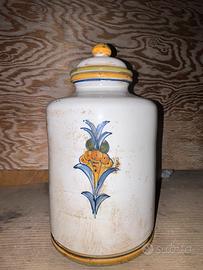 Raffinato orciolo in ceramica, usato in una farmacia storica siciliana. Dipinto a mano con linee sobrie e decorazioni vegetali.
