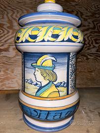 Imponente orciolo in ceramica, dipinto a mano con motivi barocchi blu e giallo ocra. Un tempo utilizzato per conservare unguenti e preparazioni galeniche, oggi è un elemento decorativo di grande pregio.