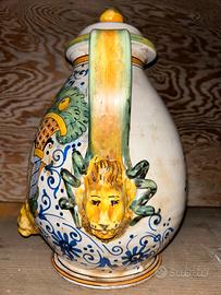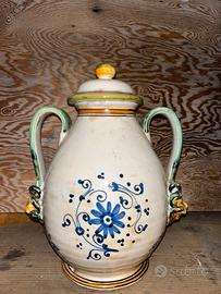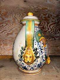 Magnifico orciolo in ceramica vintage di manifattura siciliana, dipinto interamente a mano da maestri ceramisti locali. Proveniente da un’antica farmacia isolana, presenta decori tradizionali con motivi floreali e iscrizioni tipiche dei contenitori farmaceutici del primo ’900.