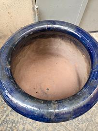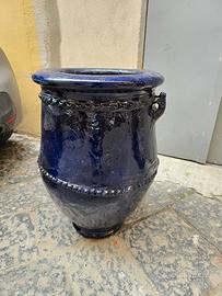 Splendido orcio in terracotta, caratterizzato da una smaltatura lucida di un profondo color blu cobalto. Un pezzo d'arredamento che unisce la rusticità della tradizione artigianale a un'estetica moderna e raffinata.