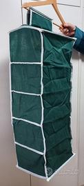 Organizer a sospensione da appendere all'armadio per tenere in ordine i tuoi vestiti. Cin-que ripiani spaziosi. Chiusura con velcro per fissarlo all’asta dell’armadio. Tessuto poliestere. Dimensione di ogni ripiano quadrato cm 28 x 28. Lunghezza totale cm 92.