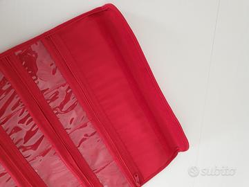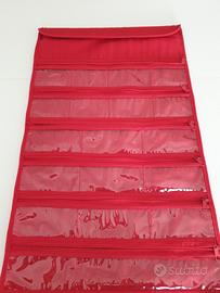 Organizer portagioielli da appendere con gruccia o da viaggio arrotolabile. In buone condizioni. Colore rosso. Misure 83 x 33,5 cm.