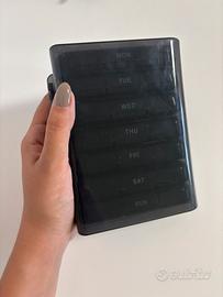 vendo due porta pastiglie: uno nero settimanale con tre slot per giorno e uno più piccolo azzurro utilizzabile giornalmente o in più giorni.