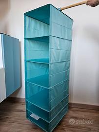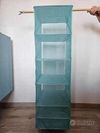 Pratico organizer pensile per armadio modello. Ideale per ottimizzare lo spazio e tenere in ordine maglioni, magliette, accessori o biancheria. Il prodotto è dotato di una chiusura a velcro nella parte superiore che permette di appenderlo facilmente a qualsiasi bastone appendiabiti senza bisogno di attrezzi. Il retro è in rete traspirante per garantire il ricircolo dell'aria tra i capi. Stato: Ottimo/Pari al nuovo. Pulizia: Tessuto pulito, senza macchie o strappi. Struttura: Gli inserti rigidi sono dritti e non imbarcati. Dimensioni: - Larghezza: 35 cm - Profondità: 45 cm - Altezza: 125 cm Materiali: 100% poliestere
