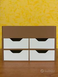 Organizzatore da scrivania. Impilabile per i livelli che portano i cassetti. Ultimo piano aperto, come in foto. Venduto standard in 3 livelli (2 porta cassetti + 1, come in foto), potete chiedere per avere più ripiani (anche per il prezzo). Prodotto venduto nuovo con imballaggio originale.
