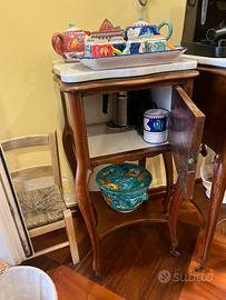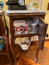 Medico offre causa ristrutturazione una splendida coppia di comodini stile inglese inizio novecento in mogano massello, con piedi ricurvi e minirotelline, con piano in legno se usati come comodini in stanza da letto oppure con piano in marmo di Carrara sagomato per usarli, come in foto, per originali complementi di arredo in cucina soggiorno.